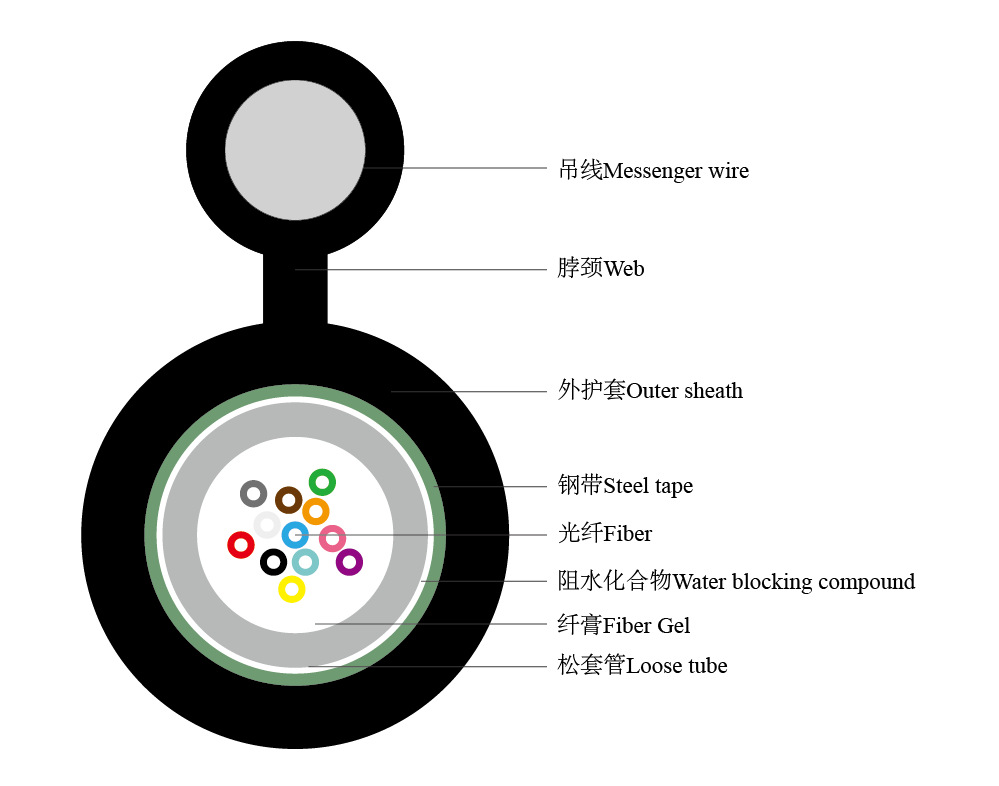 Su estructura combina un tubo holgado central lleno de gel, armadura de cinta de acero corrugado, y un cable mensajero separado—ya sea un cable de acero galvanizado o un cable de acero único—formando un perfil fuerte y confiable en forma de 8, ideal para tramos de poste a poste.